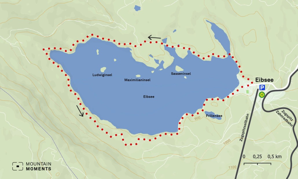 Start/finish: Eibsee parking lot/bus stop (coordinates: geogr. 47.457402, 10.991100)