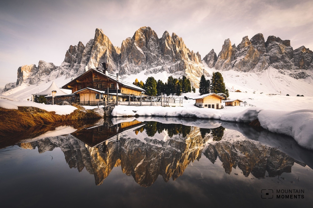 The most popular photo spots are in the immediate vicinity of the Geisler hut and the Gampen hut. At the Geisler hut, it is best to walk a few meters north to a small hill in order to photograph the lush meadow with the alpine hut and the Geisler peaks behind it. There is also a similar perspective at the Gampen hut.