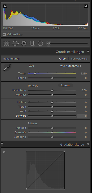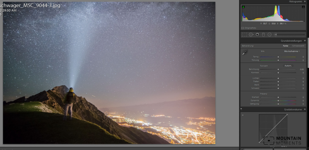 - Image editing: Choose a suitable color temperature, bring out the bright colors in the sky. Lighten the foreground selectively. Naturalness for the win: Don’t overdo it with the color saturation. Sharpen the stars.