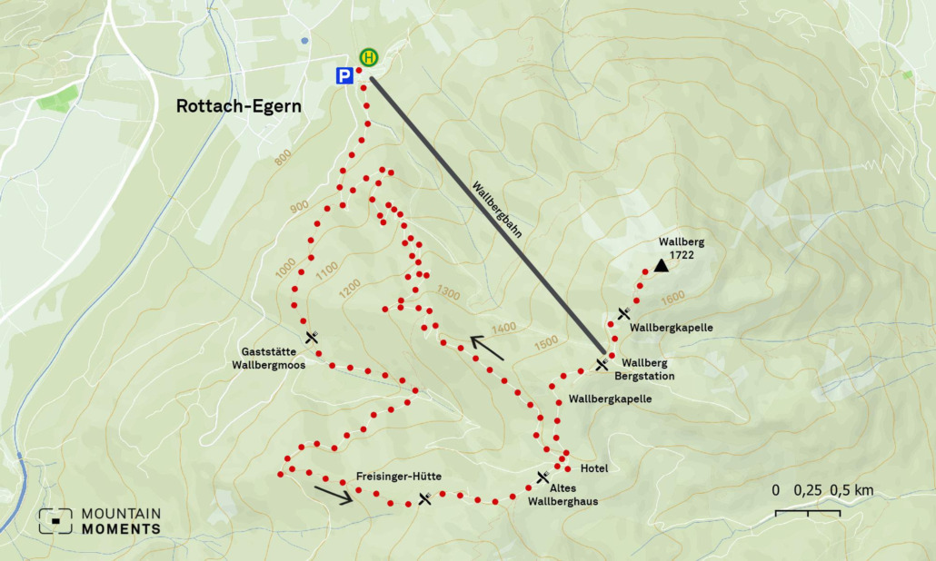 A 12.5-kilometer hiking trail shown on this map is graded “medium” in difficulty and can be covered in approximately 5 hours. The refreshments stops available are Rottach-Egern, Wallbergmoos restaurant, Wallberghaus, and Wallberg mountain station. This tour starts at the Wallbergbahn car park.